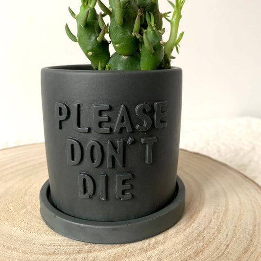 Cache pot jesmonite "Please don't Die" avec soucoupe Iris Gris anthracite
