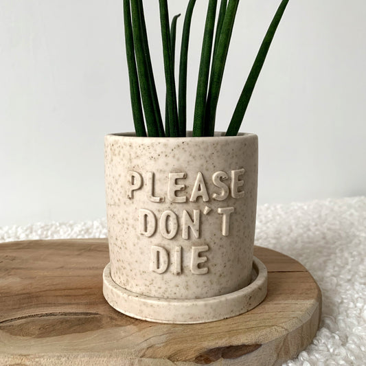 Cache-pot beige moucheté fait main avec soucoupe "Please don't Die" Iris